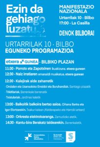 Horregatik guztiagatik, urtarrilaren 10ean, larunbatean, Bilbo aldarrikapen demokratikoaren eredu izango da, eta etorkizun partekatu baten aldeko apustua egingo da bertan, Euskal Herriak urtetan jasan duen iraganaz bestelakoa izan dadin.