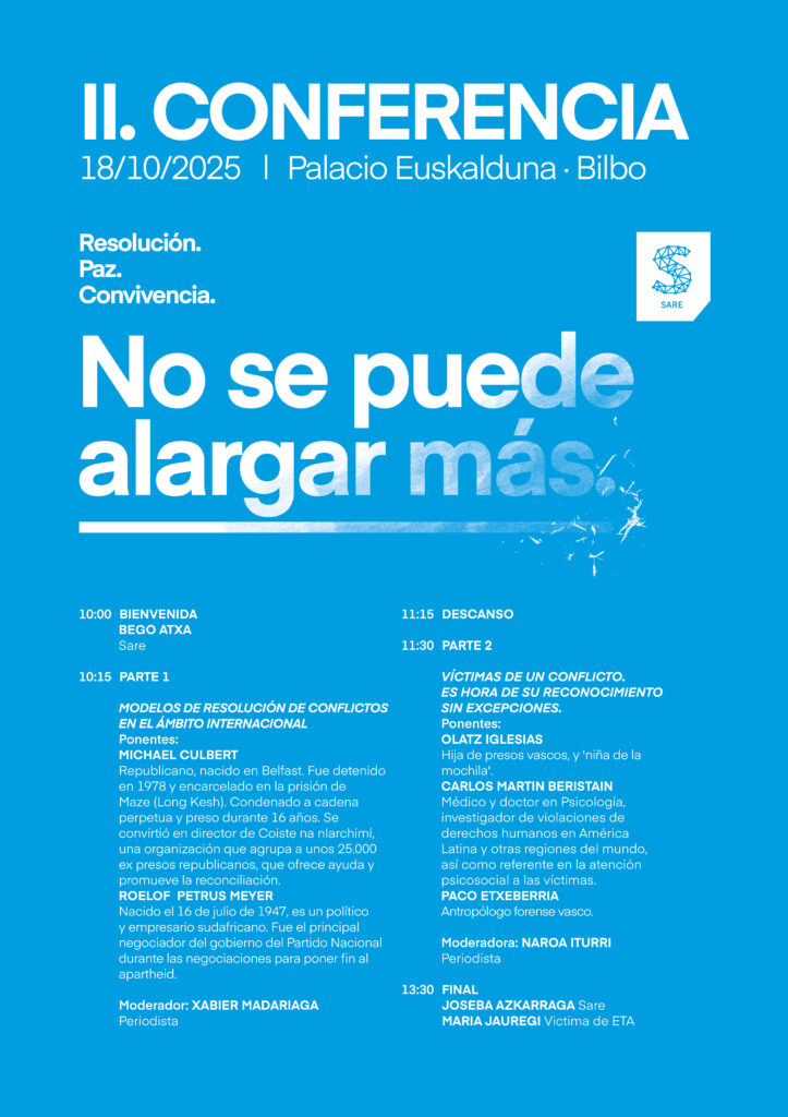 Desde SARE, consideramos que respeto, reparación, reconocer el daño producido, cambiar valores y actitudes sociales, son los elementos clave en la buena dirección del futuro. Necesitamos verdad, justicia igual para todos y todas y decisiones políticas y resoluciones judiciales en claves restaurativa y de convivencia.