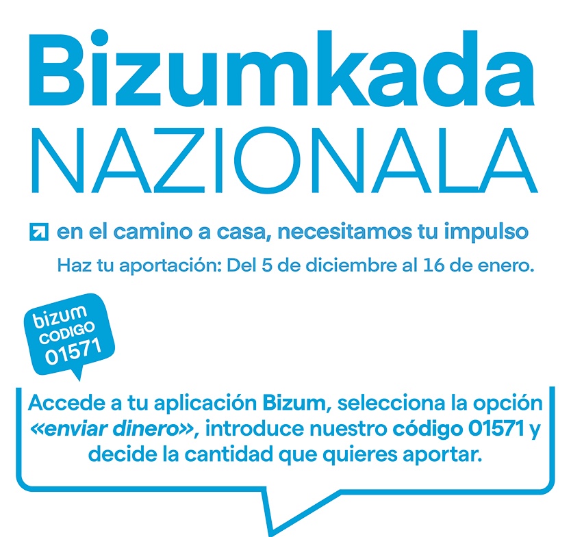 Este año, por primera vez, tanto en los días previos como en los posteriores a la manifestación del 10 de enero, la sociedad vasca tendrá una nueva forma de aportar a esta movilización. Nosotros la hemos llamado «BIZUMKADA NAZIONALA», una iniciativa mediante la cual cualquier ciudadano o ciudadana podrá realizar una aportación económica, asista o no a la manifestación.