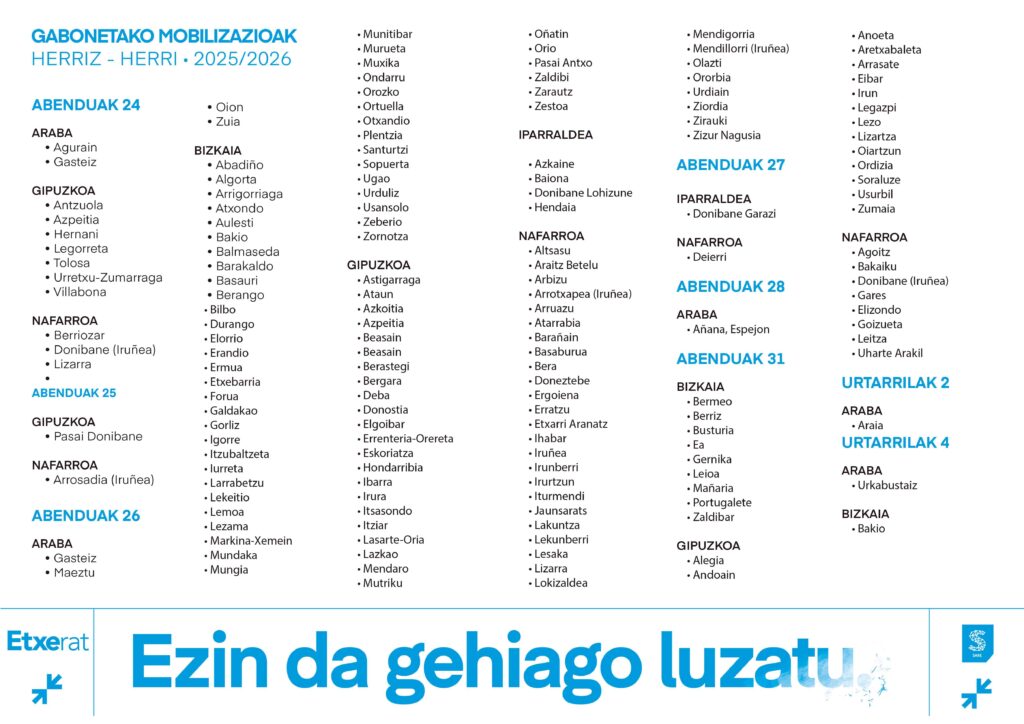 Habrá concentraciones en todos los territorios y servirán para impulsar y calentar la manifestación nacional que se celebrará el 10 de enero en Bilbao. Ese día, miles de ciudadanas y ciudadanos llenaremos de nuevo las calles de Bilbao para reclamar el regreso a casa de las personas presas, refugiadas y deportadas, y para exigir una solución, paz y convivencia para este pueblo.